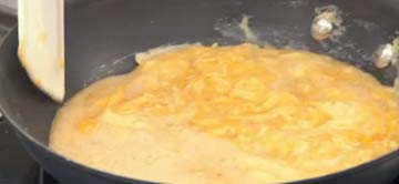- To cook the omelette, break 3 large eggs into a well buttered skillet pan, season and stir then let the egg cook out to form the omelette base.