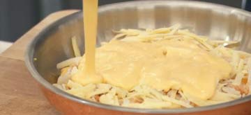 - Remove from the heat and sprinkle on grated cheddar cheese and gruyere cheese then add the haddock sauce mix to evenly cover the omelette.